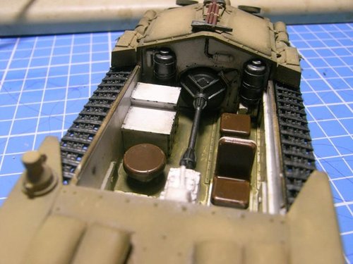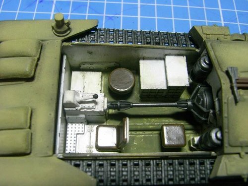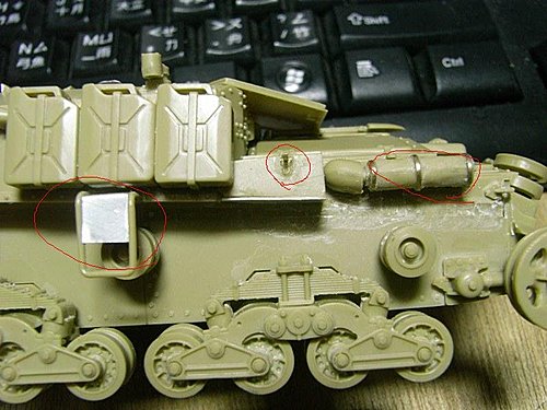 1.登車踏版使用鋁罐自製,2.盒蓋追加德軍用車輛鎖扣 3.排氣管使用廢蝕刻條展現細節,另外由於北非樣式是初期型,而田宮的是後期型,所以將黏好的側面擋泥版後半段都切除